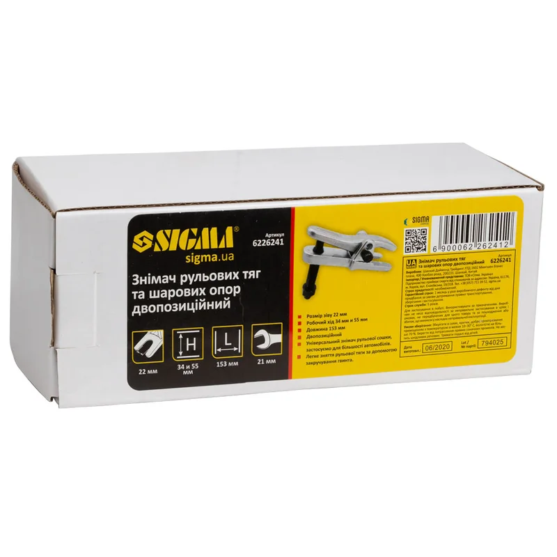 Знімач рульових тяг та шарових опор 22мм двопозиційний H 34/55мм SIGMA (6226241) призначений для зняття шарнірів в почіпці та рульового управління більшості невеликих легкових автомобілів і легких вантажівок. Конструкція знімача складається з штампованого сталевого корпусу та болта. Максимальне розкриття в 34 та 55 мм забезпечується за рахунок двоступеневої конструкції, яка дозволяє використовувати знімач з різними агрегатами.