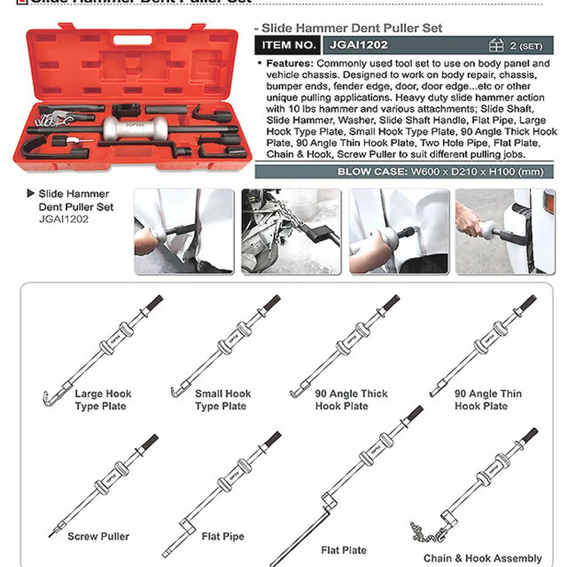 Обратный молоток для рихтовки (12 ед.) TOPTUL JGAI1202 позволяет выполнять разные работы по кузовному ремонту. Все насадки изготовлены из качественной стали, имеют увеличенный запас прочности и предназначены для профессионального использования.Удобно использовать в ограниченном пространстве.Упаковка: прочный переносной кейс.Габаритні розміри: 600х210х100 мм. Комплектація:зворотний молоток великий гак пластинчастого типу малий гак пластинчастого типу гак пластинчастого типу ( кут 90°) тонкий гачок пластинчастого типу ( кут 90°) гвинтовий знімач плоска пластина трубка з лопаткою ланцюг і гачок