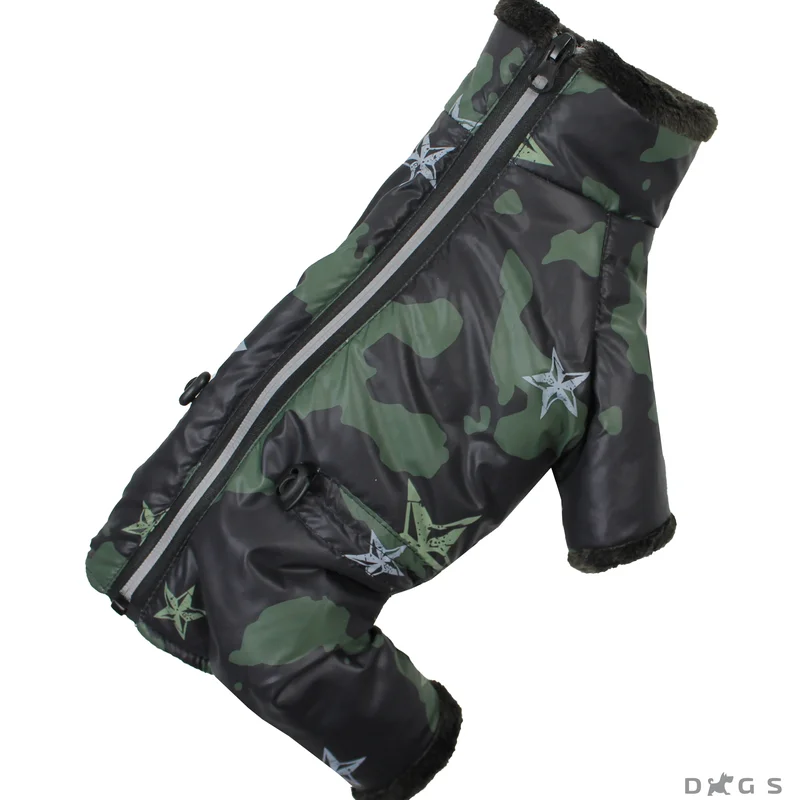 тканина водовідштовхувальна плащівка; наповнювач синтепон; підкладка фліс; обробка рукавів, штанів, горловини з плюшевого хутра; застібається змійкою на спині, змійка люкс прогумована, що не промокає; регулятор обхвату грудей на фіксаторах, модель унісекс.