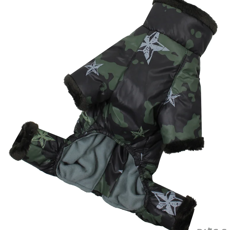 тканина водовідштовхувальна плащівка; наповнювач синтепон; підкладка фліс; обробка рукавів, штанів, горловини з плюшевого хутра; застібається змійкою на спині, змійка люкс прогумована, що не промокає; регулятор обхвату грудей на фіксаторах, модель унісекс.