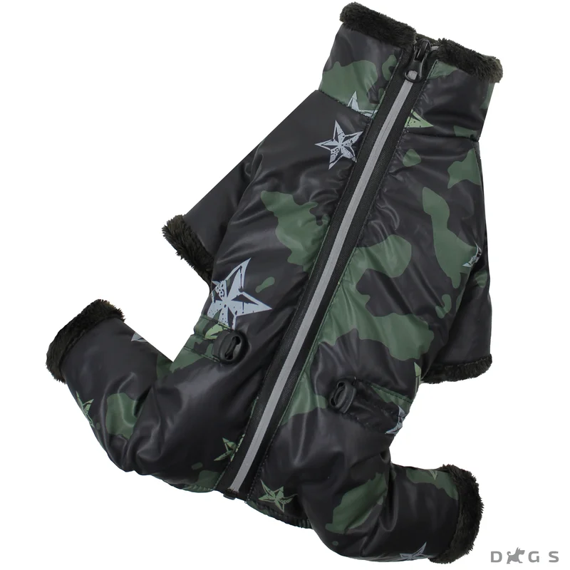тканина водовідштовхувальна плащівка; наповнювач синтепон; підкладка фліс; обробка рукавів, штанів, горловини з плюшевого хутра; застібається змійкою на спині, змійка люкс прогумована, що не промокає; регулятор обхвату грудей на фіксаторах, модель унісекс.