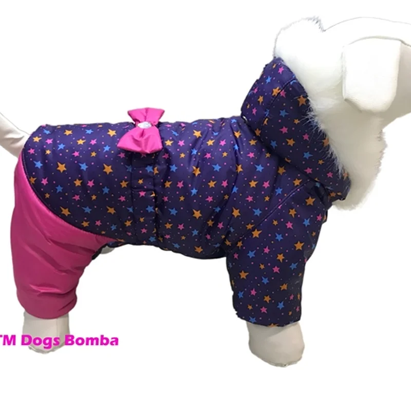 тканина водовідштовхувальна плащівка; наповнювач синтепон; підкладка нейлон; капюшон з кнопкою фіксатором; опушка штучний хутро; модель для дівчинки: живіт ЗАКРИТИЙ; на шиї проріз для повідця; застібається кнопками на животі.