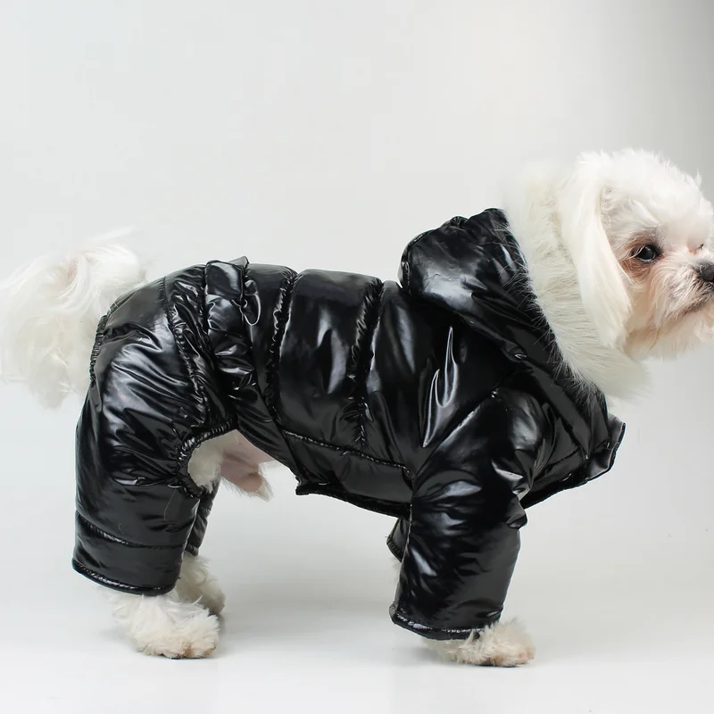 тканина водовідштовхувальна плащівка наповнювач синтепон підкладка нейлон капюшон з кнопкою фіксатором опушка штучне хутро рукава, штани, пояс з резинкою на шиї проріз для повідця застібається кнопками на животі модель унісекс