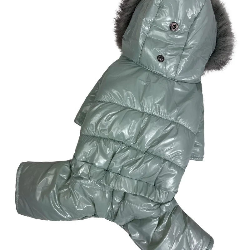 тканина водовідштовхувальна плащівка наповнювач синтепон підкладка нейлон капюшон з кнопкою фіксатором опушка штучне хутро рукава, штани, пояс з резинкою на шиї проріз для повідця застібається кнопками на животі модель унісекс