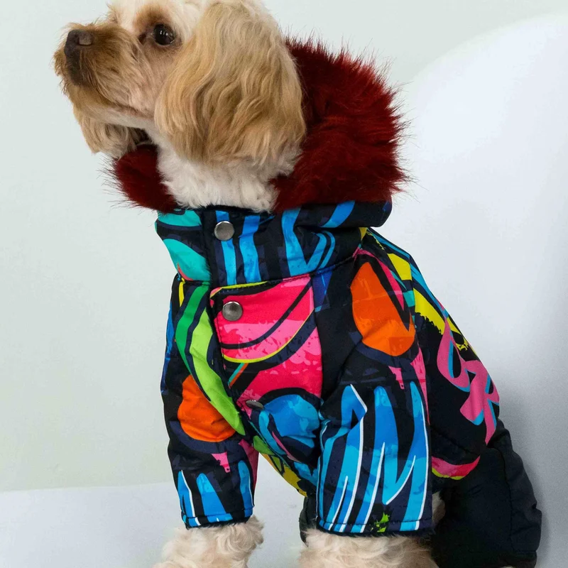 тканина водовідштовхувальна плащівка наповнювач синтепон підклад з плюшевого хутра комір-стійка для захисту шиї від холоду капюшон з кнопкою фіксатором на шиї є отвір для повідця застібається кнопками на животі на комірі може бути 1 або 2 кнопки, в залежності від розміру модель унісекс