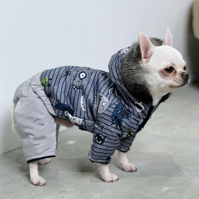 тканина водовідштовхувальна плащівка наповнювач синтепон підклад з плюшевого хутра комір-стійка для захисту шиї від холоду капюшон з кнопкою фіксатором на шиї є отвір для повідця застібається кнопками на животі на комірі може бути 1 або 2 кнопки, в залежності від розміру модель унісекс