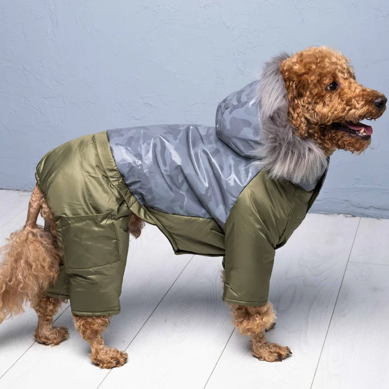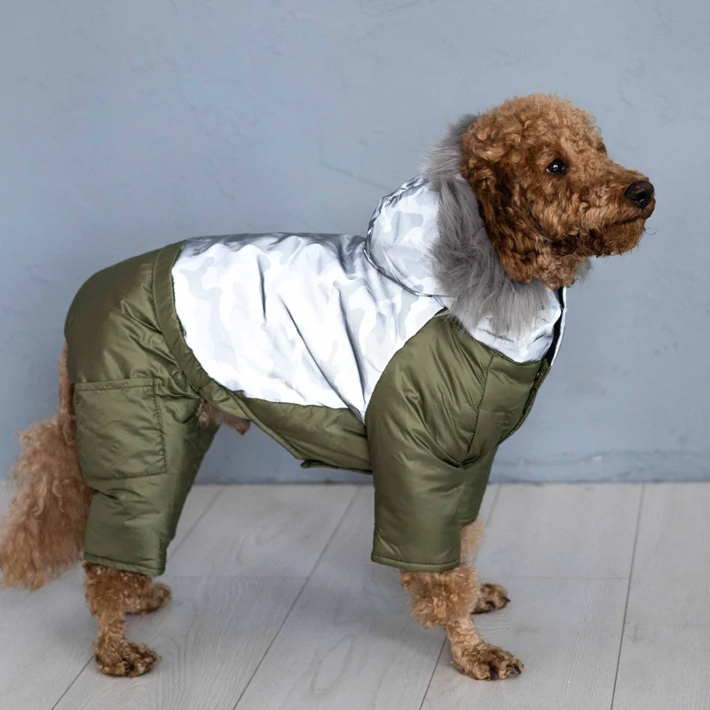 тканина світловідбиваюча плащівка комбінезон світиться при направленні на нього будь-якого світла перше фото в темряві, при направленні світла на комбінезон кращий вибір для безпечних прогулянок ввечері, собаку видно на дорозі наповнювач синтепон (200 г / м²) підклад з водооталкивающая плащової тканини на шиї отвір для повідця капюшон з кнопкою фіксатором комірець стійка застібається кнопками на животі модель унісекс